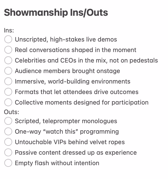 The return of showmanship isn’t a return to the old model. Today’s audiences don’t want to be talked at by celebrities or CEOs. They don’t want one voice elevated above all others. They don’t want polished perfection that feels disconnected from why they showed up in the first place.